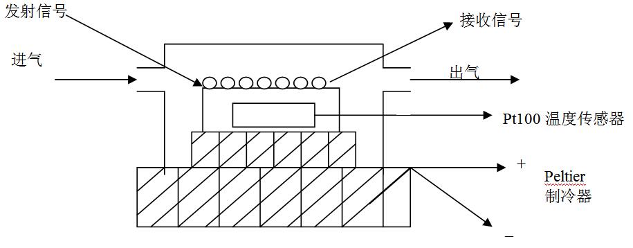 如图1所示,气体通过露点测量室时掠过露层传感器。当露层传感器温度高于该气体的露点温度时,露层传感器呈干燥状态,此时,通过露层传感器的发射信号和接收信号,经控制回路比较、放大,驱动热电制冷器(由一级或数级Peltier元件组成),对露层传感器制冷;当露层传感器温度降至样气的露点温度以下时,露层传感器上开始结露(或霜),这时接收器采集的信号产生变化,此变化经控制回路比较、放大后调节热电制冷器激励,使其制冷功率减小,zui后,露层传感器温度保持在样气的露点温度上。