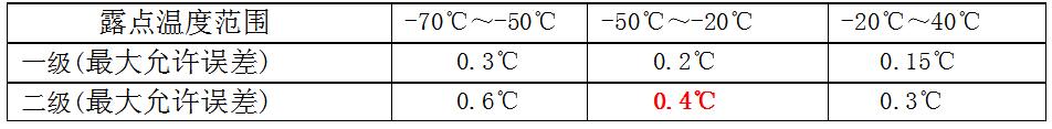 精密露点仪的示值误差为仪器测量的平均值Td 与计量检定值Td’之差,精密露点仪在露点温度-70℃~+40℃之间的zui大允许误差应符合表1中的技术要求。
