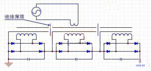 这种方式的电路示意图如图3所示。特点是,磁芯是由多段组合而成,每段磁芯之间都用绝缘性能很好的薄膜进行绝缘。每段磁芯都有一个次级绕组。优点是:适合较大功率的输出。变压器数量少,只需要一副磁芯。每段次级绕组与磁芯的电压差小,次级绕组对磁芯的绝缘容易处理。缺点是:磁芯是分段的,结构复杂。磁芯有气隙,分段越多,等效气隙越大,磁芯固定困难。