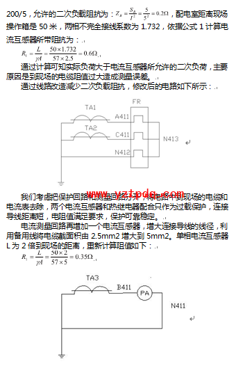 最好的解决办法是不增大电缆截面积的情况下,应该优先选用200/1的电流互感器,同样5VA的容量下允许的二次负荷为5Ω,原来的2.5mm2电缆足够满足要求,不会增加很多成本,同时满足更远距离的测量要求。