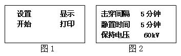 当设定的实验完成后,显示器将返回显示菜单此时,选择到“显示”选项按“确认”键,显示器可显示每次击穿值和平均值。并回到菜单下。 在菜单下,选择到“打印”选项按“确认”键,打印机将打印一次所有实验结果然后自动返回菜单。