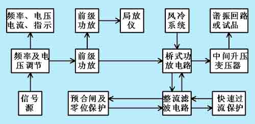 电源装置的大功率输出采用逐级放大的原理(见图)。从zui初的微小功率信号源,经过多次放大,实现大功率输出,满足试验需要。