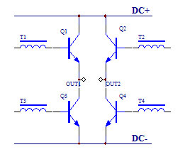 图中,Q1~Q 4为四个等效三极管,分别对应变电源的四个桥臂。每个桥臂由数千只三极管并联组成,并采取了有效的均衡电流措施。正半周时,前级放大信号通过推动变压器(T1~T4)作用于Q1~Q4三极管的基极,Q2,Q3截止;Q1,Q4导通,电流由Q1至负载再到Q4形成正弦波的正半周。负半周时模拟信号推动Q2,Q3的基极,Q1,Q4截止,Q2,Q3导通, 电流由Q3至负载再至Q2形成正弦波的负半周, 从而在负载上构成一个完整的正弦波。