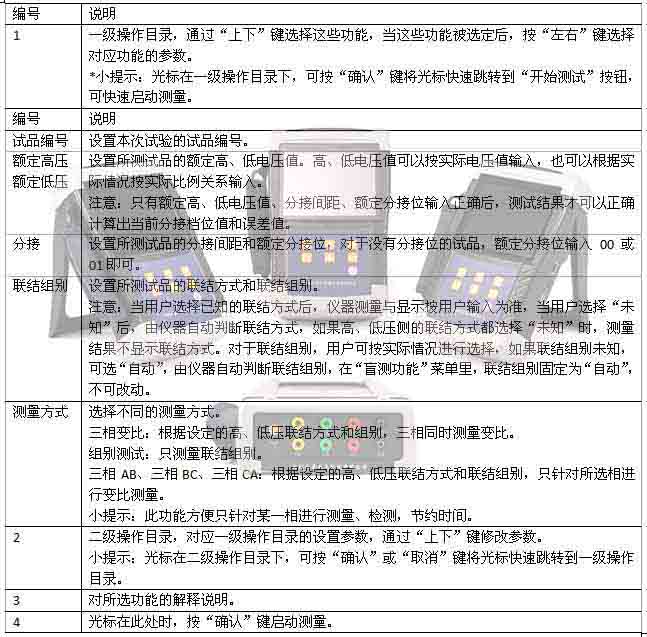 对于具有多个分接位的变压器,输入额定高、低压电压值、分接间距、额定档位,是为了使测试结果可以自动计算出误差值,以及分接开关所处的分接位。